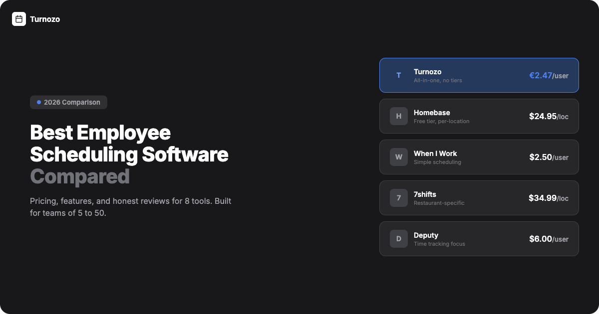7shifts pricing starts at $29.99/location. Homebase has a free tier. Turnozo is €2.47/user. Side-by-side comparison with real costs for your team size.