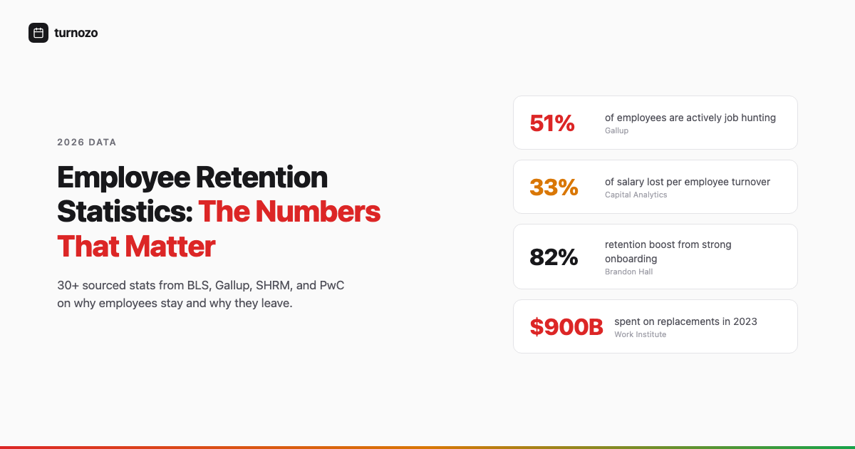 51% of employees are job hunting right now. Turnover costs 33% of salary. 30+ retention stats with sources from BLS, Gallup, SHRM, and more.