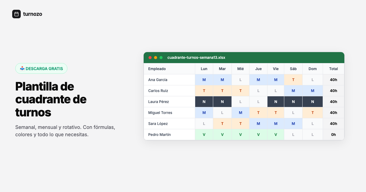 Excel funciona. No vamos a fingir lo contrario. Si tienes 3-5 empleados con turnos fijos, una plantilla bien hecha te resuelve la semana en 10 minutos.